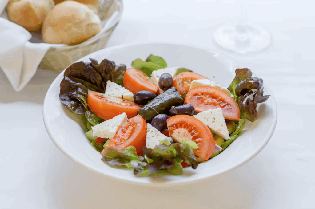 Frische Tomaten, Gurken, Oliven und Feta in perfekter Harmonie.